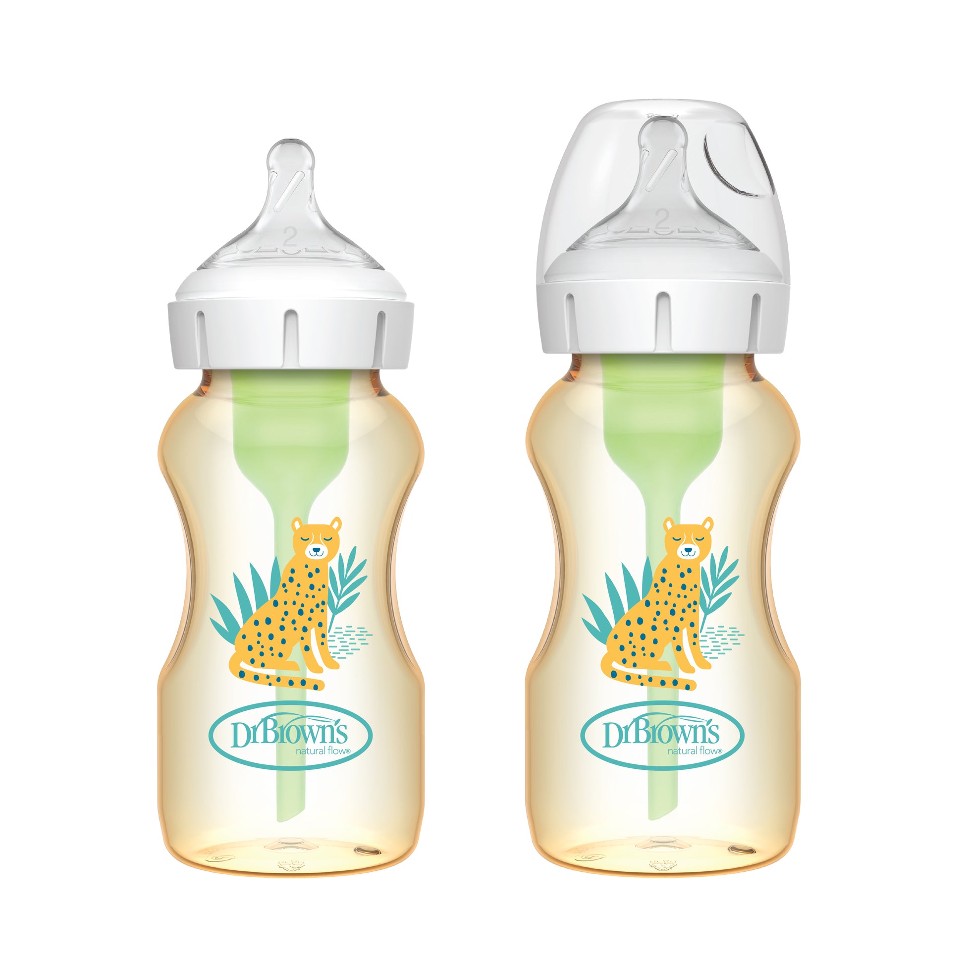 Dr. Brown’s Anti-Colic Options+ PPSU Wide Neck 9oz/270ml Bottle, Cheetah, 2 Bottles, Level 1 Teat