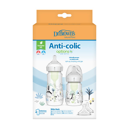 Dr. Brown’s Anti-colic Options+ Wide-Neck Baby Bottle Sampler Kit with Level 1 and 2 Nipples, Dinosaur and Jungle Designs, 0m+, BPA Free