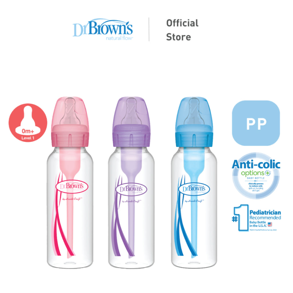 Dr. Brown's Anti-Colic Options+ PP Narrow Neck 8oz/250ml Bottle, Pink/Purple/Blue, 2 Bottles, Level 1 Teat
