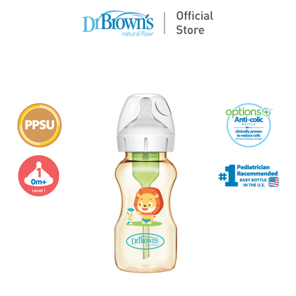 Dr. Brown’s Anti-Colic Options+ PPSU Wide Neck 9oz/270ml Bottle, Lion, 1 Bottle, Level 1 Teat