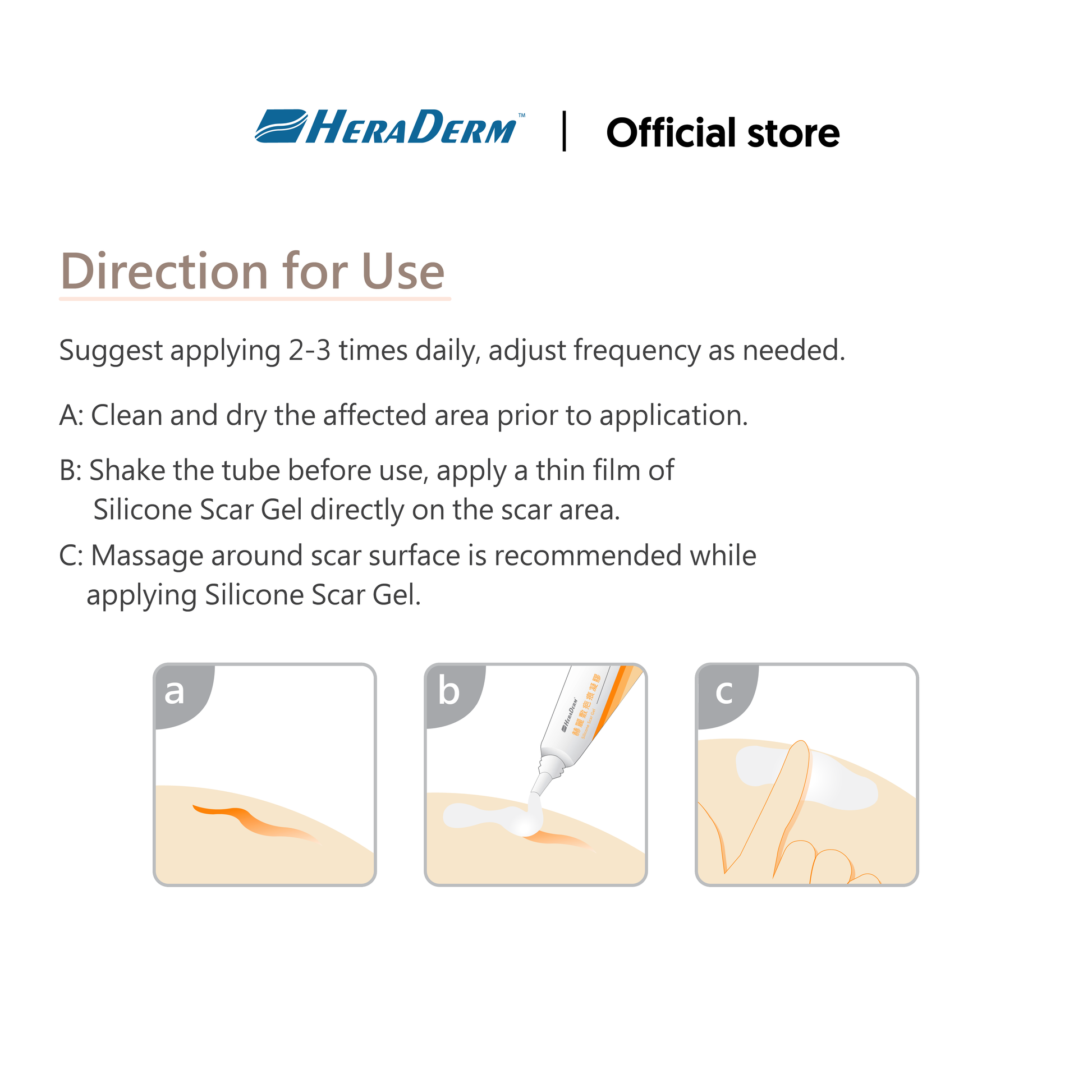 - When used together with HERADERM Scar Care Dressing, the gel should be kept within the Dressing effective area to avoid affecting the adhesiveness of the Scar Care Dressing.