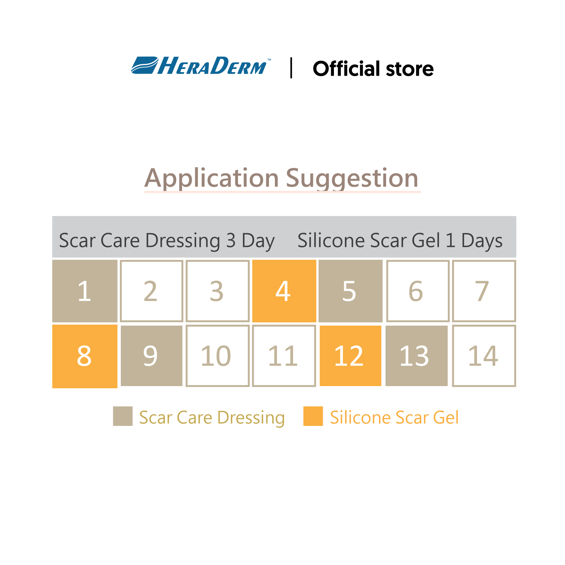 For new scars, it is recommended to use the gel together with HERADERM Scar Care Dressing. Apply Scar Care Dressing continuously for 3 to 5 days, then Silicone Scar Gel for 1 to 2 days. For best results, use both the dressing and gel continuously for up to 6 months.
