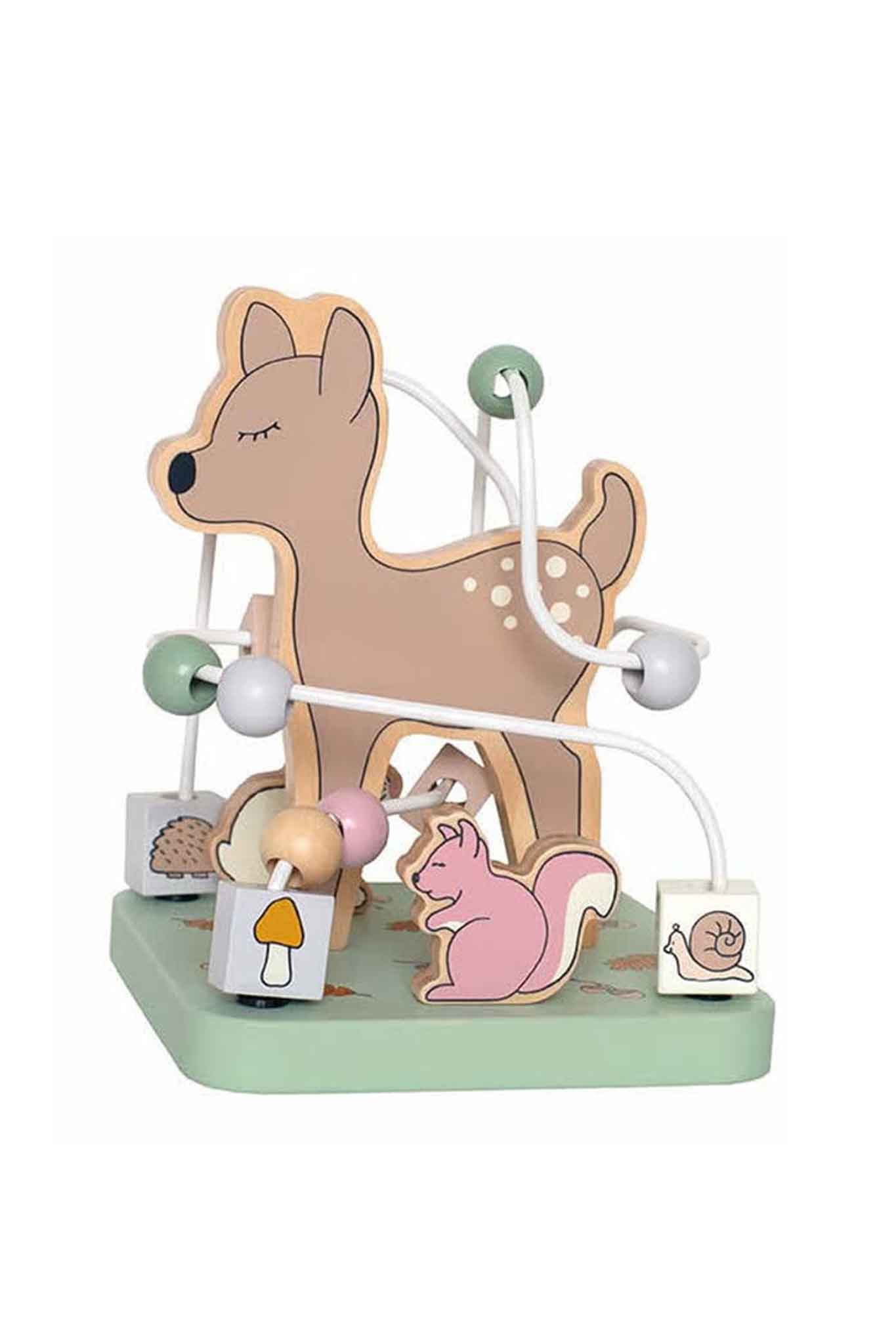 It's time to explore the forest animals! Jabadabado's wooden ball track, designed in the shape of a deer, is perfect for young children. The track features three paths with beads and small cubes, decorated with animals and mushrooms, that can be moved back and forth. As children play with this toy, they develop coordination and fine motor skills while also learning the names of the animals and plants depicted on it. It makes an ideal birthday gift for a child's first birthday.