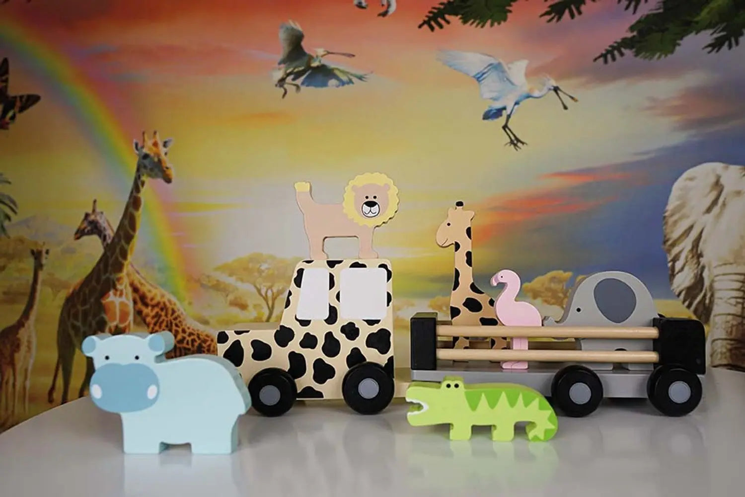 Children loves animals and will have great fun with this safari jeep. The jeep holds the most common animals found in the jungle. Load the animals on and off the jeep and drive them around on a safari trip. You can detach the trailer as well and only drive around the truck. Includes 6 different animals The jeep is detachable so you can drive the jeep separately A must-have-toy for all kids who love animals.