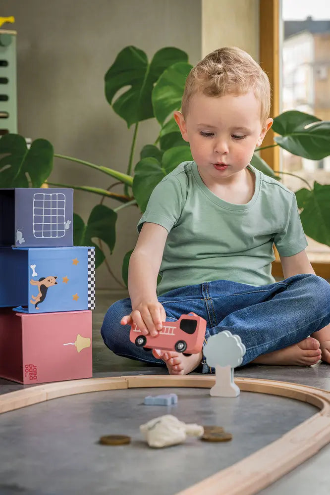 Time to fight the fire! Jabadabado's classic wooden train rail with rescue vehicles features both a police station, a fire station, and a prison. Build the rails together and place the three houses along the road, cars can drive through the police station. The police car and the helicopter search for the thieves that seem to have stolen the money! When the thieves are caught, you take them to the prison. When the hunt is over, land the helicopter safely on one of the three houses' helipad. Oh no, a cat seems to have climbed a tree and can’t come down. Hurry up and go there with the fire truck to help the cat down to the ground again. But the bad luck is not over, now a fire seems to have broken out. Toot toot, the fire engine is on its way to put it out. Phew, finally there seems to be peace and quiet in the city. Now the cars can calmly patrol along the rails, waiting for new adventures. The train rail encourages creative play and is guaranteed to keep the child occupied for hours. Can be combined with Jabadabado's garage as well as other train and car rails from both Jabadabado and other well-known brands on the market.