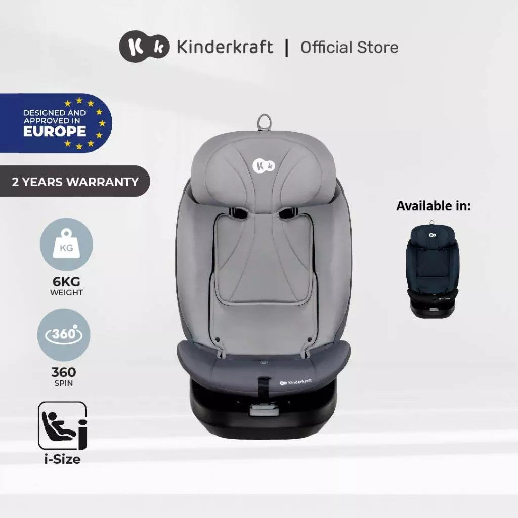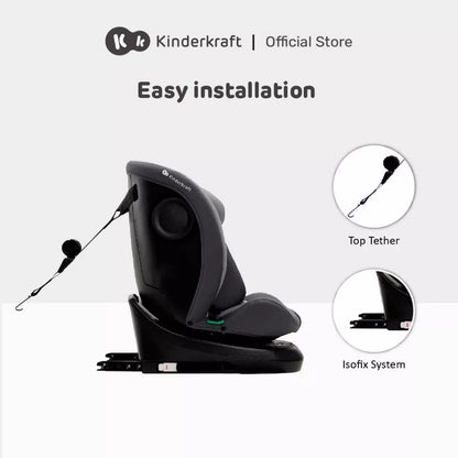 Comes with ISOFIX and TOP TETHER. EASY SPIN 360° system support rearward-facing (RWF)& Forward-facing(FWF).