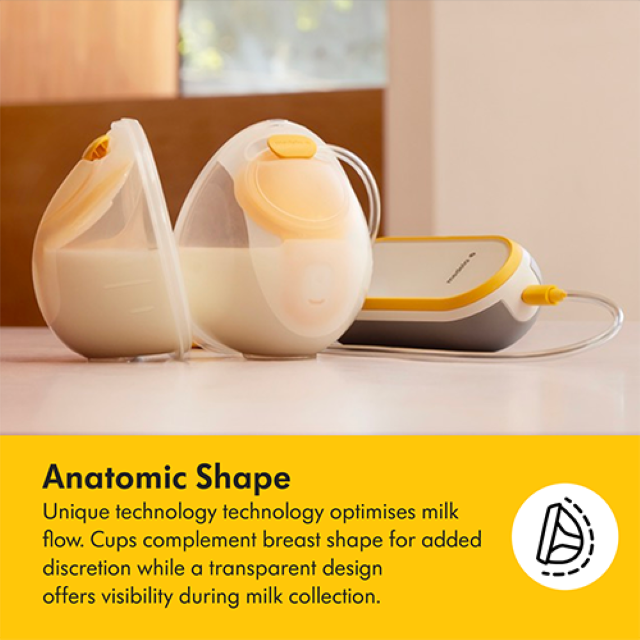 • Anatomically Designed Cups: Research-based hands-free collection cups designed to avoid localised compression and maximise milk flow, with a broader lower half to support the underside of the breast and a smooth surface and rim that flare away from the breast.